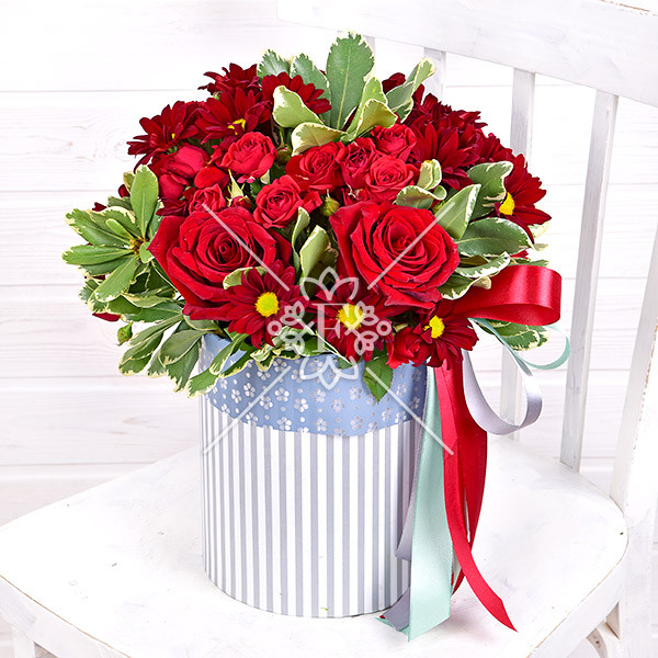 роза красная – 5 шт., роза красная кустовая – 4 шт., хризантема красная кустовая – 4 шт., зелень декоративная: питтоспорум, оазис, коробка, лента.