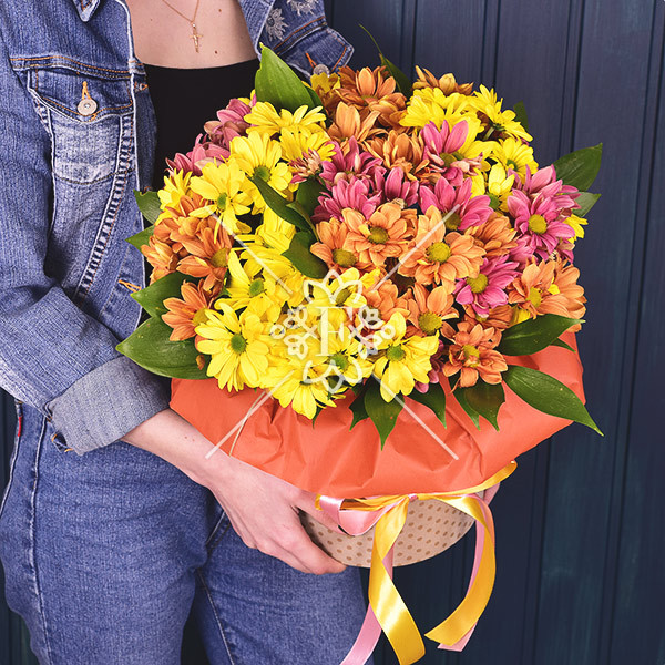 хризантемы жёлтые, оранжевые, розовые кустовые - 7 шт., зелень декоративная (рускус), оазис, коробка, лента.